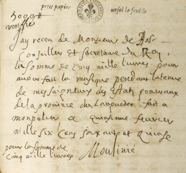 Compte de la session de 1675-1676. Dépense de 5000 livres pour Etienne Moulinié ; quittance holographe du 15 février 1675